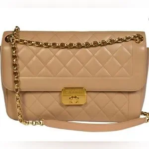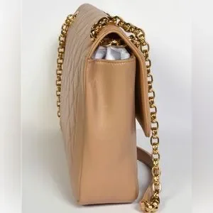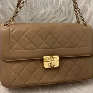 YOU WANT THIS! There’s no other like this on Poshmark! Very hard to find. Excellent condition! Chanel one owner lambskin bag in beige and gold hardware. Medium size. I purchased this in the Rodeo Drive Beverly Hills Chanel store. Used a handful of times. Very well taken care of. The hardware still has plastic covering in some areas.