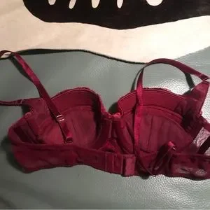 Ann Summer’s longline balcony bra in a burgundy satin with scarlet lace appliqués adorning. Underwire cups have padding and there’s three hook and eye closures in the back. Classically sexy and glamorous. I’m modeling a different size in photos. Tags have been cut.