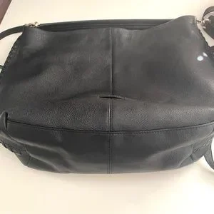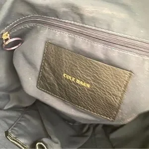 Cole Haan black leather double strap shoulder bag. Roomy bag can be carried on shoulder, crossbody or as a handbag. Longer strap is adjustable. Longer handle is detachable. Interior zipper pocket and cellphone pocket. Navy blue fabric interior has a few small marks from previous use but overall clean. Zipper pocket is missing pull but has a ring pull and works great. Please check measurements below.