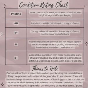 They are pre-owned and/or vintage and not brand new. They will almost always have some sort of wear. Cleaning your item is always recommended. Jewelry & hardware usually need polishing. I also recommend polishing and/or conditioning all leather items / parts.