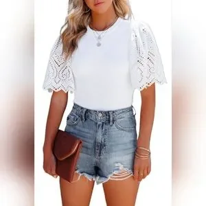 Scalloped eyelet sleeve ribbed knit top. Dressed up, pretty sleeve! See the picture for sizing. No returns.