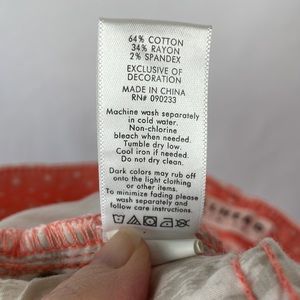 Super cute! Salmon color with small white polka dots, "skinniest" ankle jeans/pants from Bullhead Denim Company. Fabric has stretch and is comfy! 5 pocket style with rivet and zipper front fly closure. Excellent used condition - note small dark spot under waistband (see final photo). Great for any summer activities. Pair with white crop top and sandals and arrive in style for any summer outing. Size 7 Juniors.