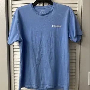 Light blue Columbia t-shirt in size large. Florida Keys logo on back with some wear noted. Material is 100% cotton. In good condition without tears or stains.