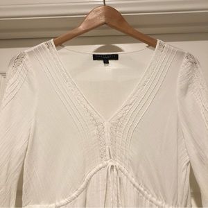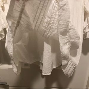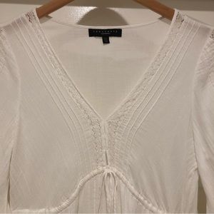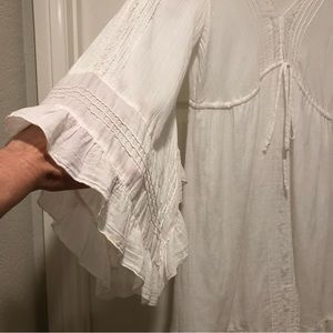 Beach vibes. Love this dress! The perfect summer dress for a beach vacation! Only worn once. (I love it but it no longer fits me.) In excellent condition. No stains. All as pictured. V-neck, ties under breasts, gorgeous detail on sleeves. 100% cotton. Machine wash cold, hang dry. Measurements: bust 38”, width from shoulder to shoulder is 15”, waist 34”, hip 44”, sleeve length 26”, dress length 35”. There is some elastic in the waist (in back) so it gives a bit. Skirt is lined. Skirt flares a bit and hits above knee. Really beautiful dress!