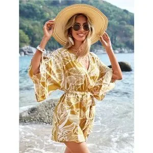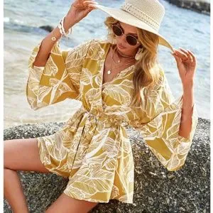 Leaf Tropical Print Mustard Yellow Romper Belted V-Neck, Surplice Batwing Sleeve
