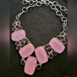 this beautiful I called" la vie in rose" is a lab created opals, beautiful pink peonies color, and dark red garnet, the design is bib necklace ,who love pink color, is the right choice.