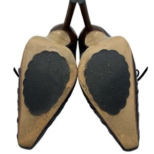 EUC Theses shoes are dreamy. Gorgeous stacked wooden heel and beautiful detailing on toe box finished with matching leather bow. The heels are 4.5” and the soles are leather. These shoes are sweet, sexy and elegant.