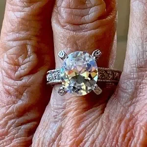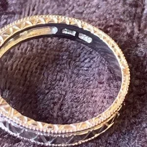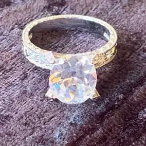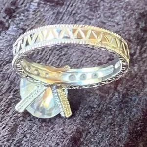 This brilliant oval CZ ring is marked GWE 925 CZ China and is set in a sterling stamped band with 3 smaller cz’s on either side of the large center stone that is held by 4 prongs in a V shape on either side. It’s a size 9 and is in like new condition. Please see all photos as they are part of the full description.