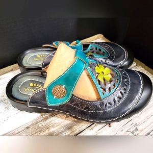 NWOT Spring Step EU 36- US 5.5 or 6 Black, teal, olive & perfect stitching and cute brass side button. Never worn so you can make these "mary-jane toe" slide Sandal all yours. These shoes literally make people happy & have a great story.