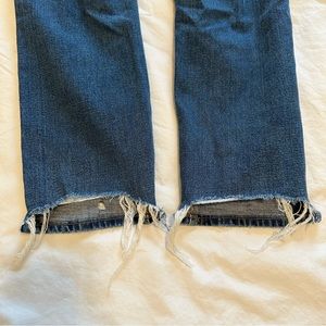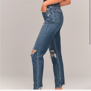 EUC! Worn only a couple of times. Abercrombie and fitch Distressed denim high waisted mom jean with frayed hem and ripped holes at knees. Medium wash. Zipper fly. Size 2S / 26S short length. Length at ankle