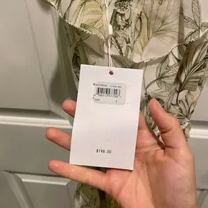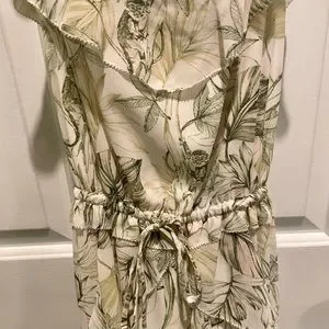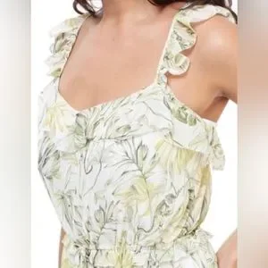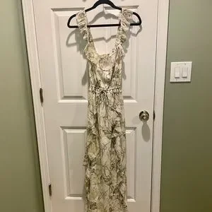 New with tags! Size 4. Flora and fauna have an elegant field day illustrating this airy maxi in an easy and flattering cut styled with ruffled details and crisscrossing back straps. Sweetheart neck. Sleeveless l. Slips on over head. Drawstring waistband. Crisscrossing back straps. Allover green tropical print. Partially lined. Length is a little short for a maxi but a little long for a midi, in my option!