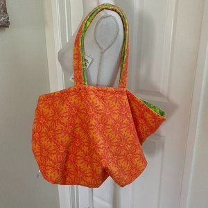 Suit up for summer with this large tote bag made of textured towel fabric in a reversible design. Complete with an exterior pocket and dual haul handles.