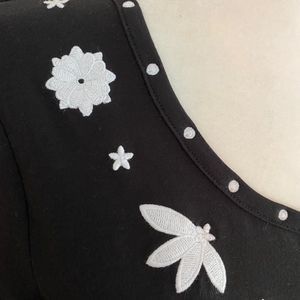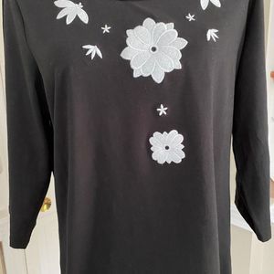 Susan Graver Style Black Top ¾ Length Sleeves Floral Embroidery SZ M