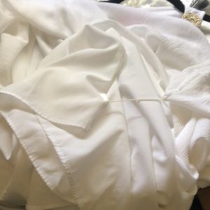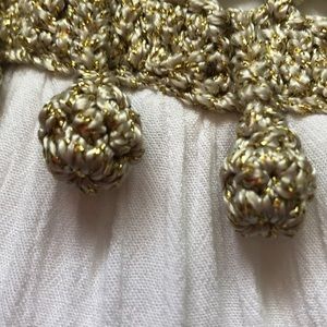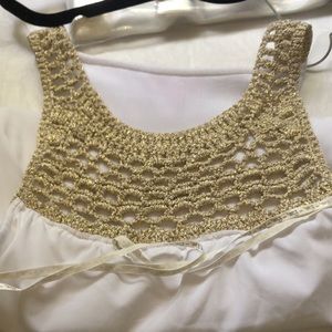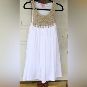 Lilly Pulitzer size large,white with gold on the top. Gorgeous dress perfect for summer even if you want and intimate wedding on the beach this dress is a beautiful piece. I visually don’t see damage or stains. A used item but like new condition.has an underskirt. The last pictures I’m showing the inside of the dress that shows the knots of the yarn to secure it.