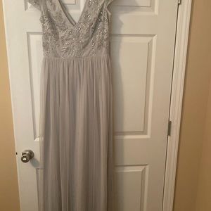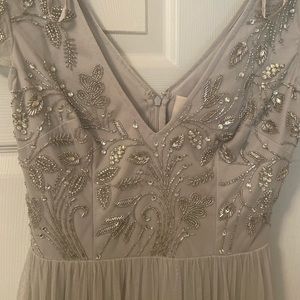 Part of special collection from BHLDN. Featuring cap sleeve and a v-neckline, with breaded bodice and an airy tulle skirt.