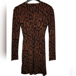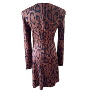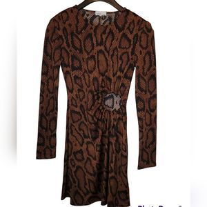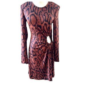 Danielle Bernstein We Wore What Snake Print Dress with Circle Cut Out Detail Size Small color brown and black, ruched detail, like new, has shoulder pads, not lined, 96% polyester 4% spandex pit to pit 18" length 38" mini excellent preowned condition (N35)😊