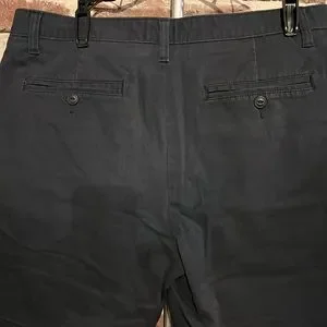 Color is navy and is more like a brushed twill; Zip front with button closure;2 side pockets and two back button pockets