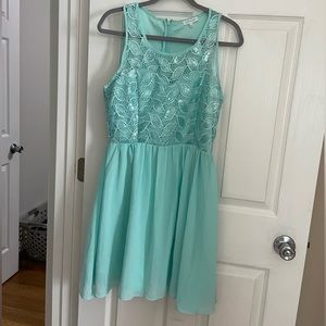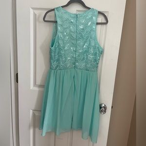 Only worn twice, sweetheart neckline with mesh and sequin overlay, little bit of staining on the neckline but only on the inside! All items come from a smoke-free home with one dog :)