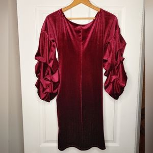 Velvet Ruched Draped Puff Exaggerated Sleeves Mini Dress, Burgundy L