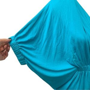 Great resort wear piece that’s very versatile. Wear as a cover up or tunic by day, and a mini dress by night during your beach vacay or cruise. Turquoise in color, batwing, goddess gathered waist front and back. Size 4. In very good condition. Lot158 BOXXC