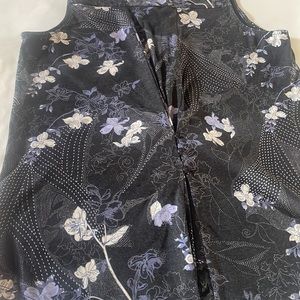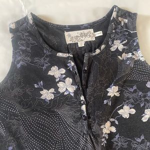 Unique organic cotton black, gray, purple and white tank with back button/unbutton pleat in back. Front of tank is adorned with 4 buttons. Cute top!