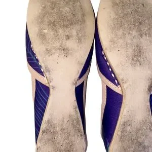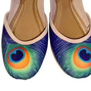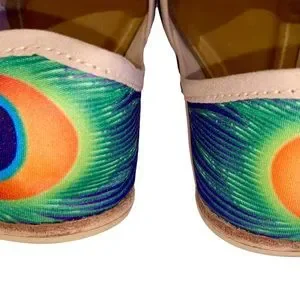 Beautiful vibrant colors in a peacock print. Excellent used condition. Most wear is shown on bottom of soles. Fuchsia brand artisan made.