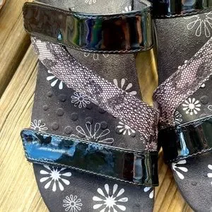 Vionic Jodie Strappy Sandal Black Patent Leather Chantily Lace Design Sz 8
