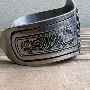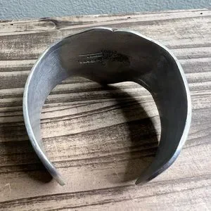 Cuff with Heart and Horse head on top. Sides taper in with design. Stamped with Logo on the interior
