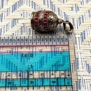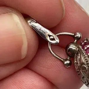 This is a beautiful vintage sterling silver and ruby enhancer ringing yoga bell pendant 🔔 in good preowned condition! The ring on this bell is very light! Great detail and no stones are missing. It’s marked on the back of the bale witch opens in the back to accommodate larger chain sized. Please view all photos for measurements, details and current condition. Thank you for looking and all sales are final ❤️