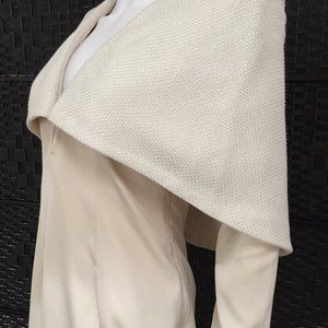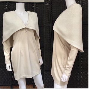 Absolutely glamorous dress in a beautiful smooth and substantial 55/45% Polyester / Cotton, and tweed effect on capelet. Sexy plunging neckline. Concealed zipper closure. Fully lined, excellent condition! Color is creamy Ivory.