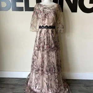 This magnificent gown has a waist size of 28" and a sleeve length of 16". The fabric has no stretch and the gown would best fit a size 4 or 6.