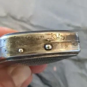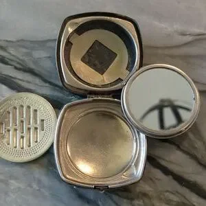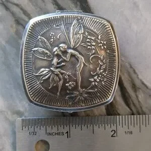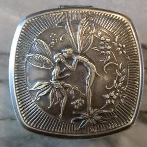 This is a very beautiful Djer Kiss duo compact in amazing condition. Silver plated with natural tarnish. The compact measures approximately 2 x 2 inches and dates to the 1920s French Art Nouveau era.