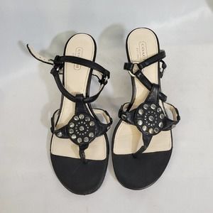 COACH Harper Black Leather Silver Stud Slingback Wedge Sandals Size 8.5. Good Pre-owned condition with minor signs of wear including rusting on the studs of 1 shoe and a nick in the leather on one heel. See photos for details of condition