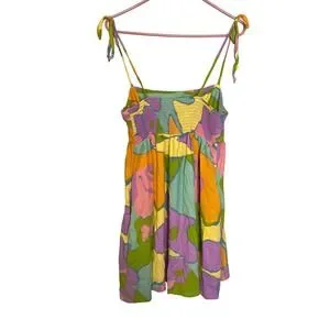 It's officially time to get summer-ready and we're loving these pops of orange, green, and purple! A square neckline meets an empire waist before ending at a flowy mini hem, while adjustable spaghetti straps and a smocked back allow for a flattering fit. Dance the night away with matching pastel heels and mini bag. , , 50% Cotton, 50% Rayon , Self tie straps , Smocked back , Pockets , 32 3/4" from shoulder to hem , , MM2-5114 XP71Size: Womens L Condition: New Without Tags ✅Items are packaged and shipped ASAP , ✅Pet Free & Smoke Free Environment