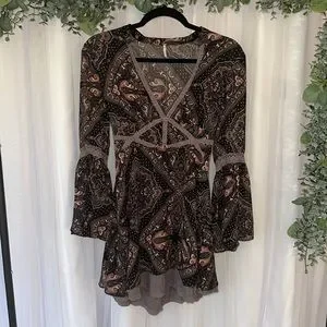 Free People, bell sleeve, paisley print dress with a purple coral black and white intricate design, pulled together beautifully with dusty lavender lace embroidery details.