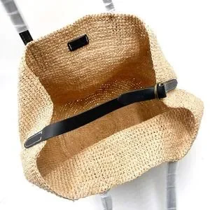 New POLO Ralph Lauren Raffia Tote Bag Tan Black Woven Straw Black Leather Straps Sz OS
