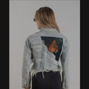 Crop distressed jacket features the words "impossible" with a lion image. Distressed hemline, long sleeves, collar, front button down, chest pockets.
