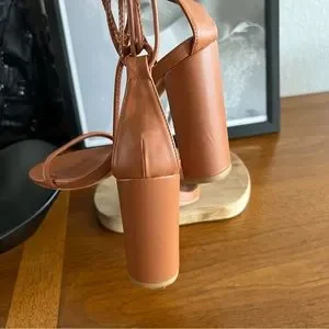 Beautiful tan strappy heeled sandals. The straps cris cross up the calves. I wore them to a spring/summer wedding :)