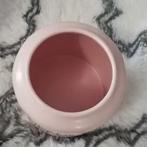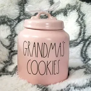 NWT Rae Dunn ceramic cookie "canister". Light pink with black writing "Grandma's Cookies".