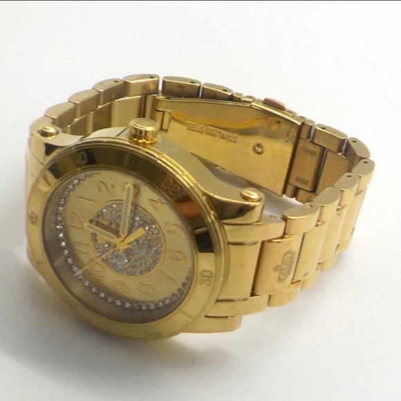 Gold tone stainless steel case with a gold metallic leather strap. Fixed bezel. Reflective gold tone dial with gold-tone hands and index hour markers. Dial Type: Analog. Quartz movement. Scratch resistant mineral crystal. Pull / push crown. Solid case back. Case size: 38 mm. Case thickness: 8 mm. Round case shape. Band width: 18 mm. Buckle clasp. Water resistant at 30 meters / 100 feet. Functions: hour, minute, second. Casual watch style. Juicy Couture HRH Ladies Watch 1900835.