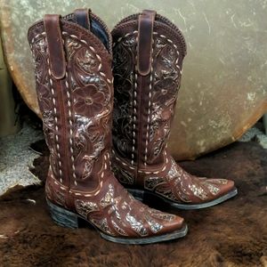 LANE "Poison" floral Chestnut brown & metallic snakeskin underlay cowgirl boots