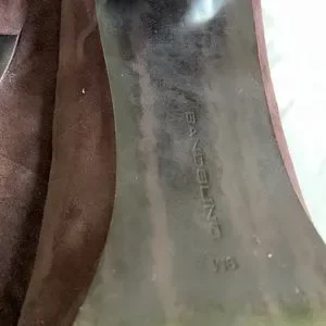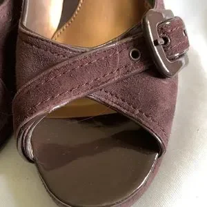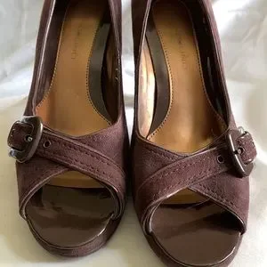 4 inch chunky heel with .5 inch platform. The color is a rich brown. These have all of my favorites, buckles, platform and peep toe! I believe they are suede but the tag inside is worn off. They are in great shape with a flaw on the inside of the right shoe; pictured, and the left seems to be developing the same way. I am not sure of the size, but the internal measurement is 10” almost to the end. following bandolino size guide, this makes them a 9,