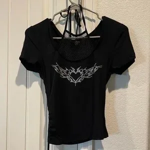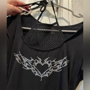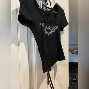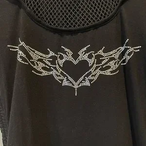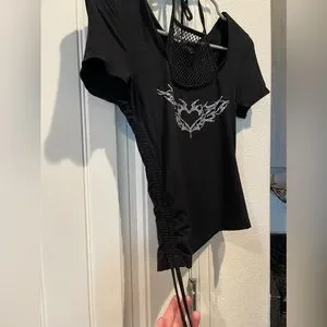 Romwe Crop Tee, with fishnet collar that can be adjusted around the neck like a halter. The side of the shirt also has a place you can tighten it on one side to make it more form fitting and sexy 😉 All the Rhinestones are there, I only tried it on one time to see if it would fit and it didn’t 😣 Wish it had, it’s very sexy and perfect for a night out to a concert !