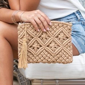 This Macrame Woven Design clutch features a beautiful macrame pattern with intricate woven details. It has an inside lining, an inside open pocket, a tassel accent, and a zip closure. Pair it with a flowing maxi dress for a bohemian-inspired look and wear it to a garden party or a casual outdoor gathering.