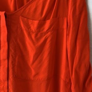 Soft flowy orange rayon blouse with 3/4 length sleeves. Two big front pockets and buttons covered by placket. In good used condition.