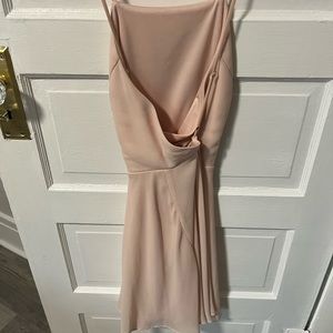 Lightweight woven poly falls from adjustable spaghetti straps that crisscross at back, into a high, apron neckline. Fitted waist and flirty skater skirt. Elastic at back for fit, and hidden zipper/clasp.
