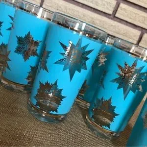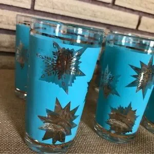 These are incredibly fabulous tumblers with a very mod aqua and gold starburst/snowflake pattern. Each tumbler measures 5" tall and 2.5" wide. They have gold rims as well. There are no maker's mark, but have weighted bases.