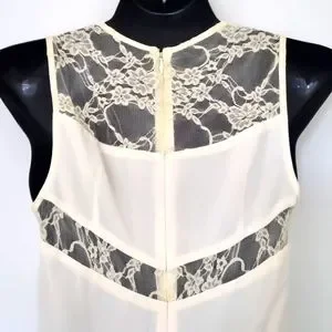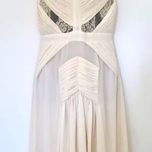 Jarlo, cream long formal dress, lace details, lined, sheer overlay, size 6