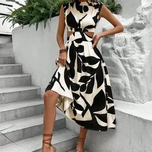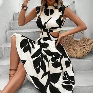 Black & White Boho Womens Leaf Print Cut Out Waist Dress