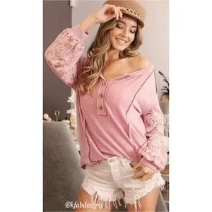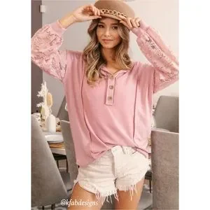 ❤️NEW! Button Henley Style Dusty Rose Floral Lace Sleeve Top!
